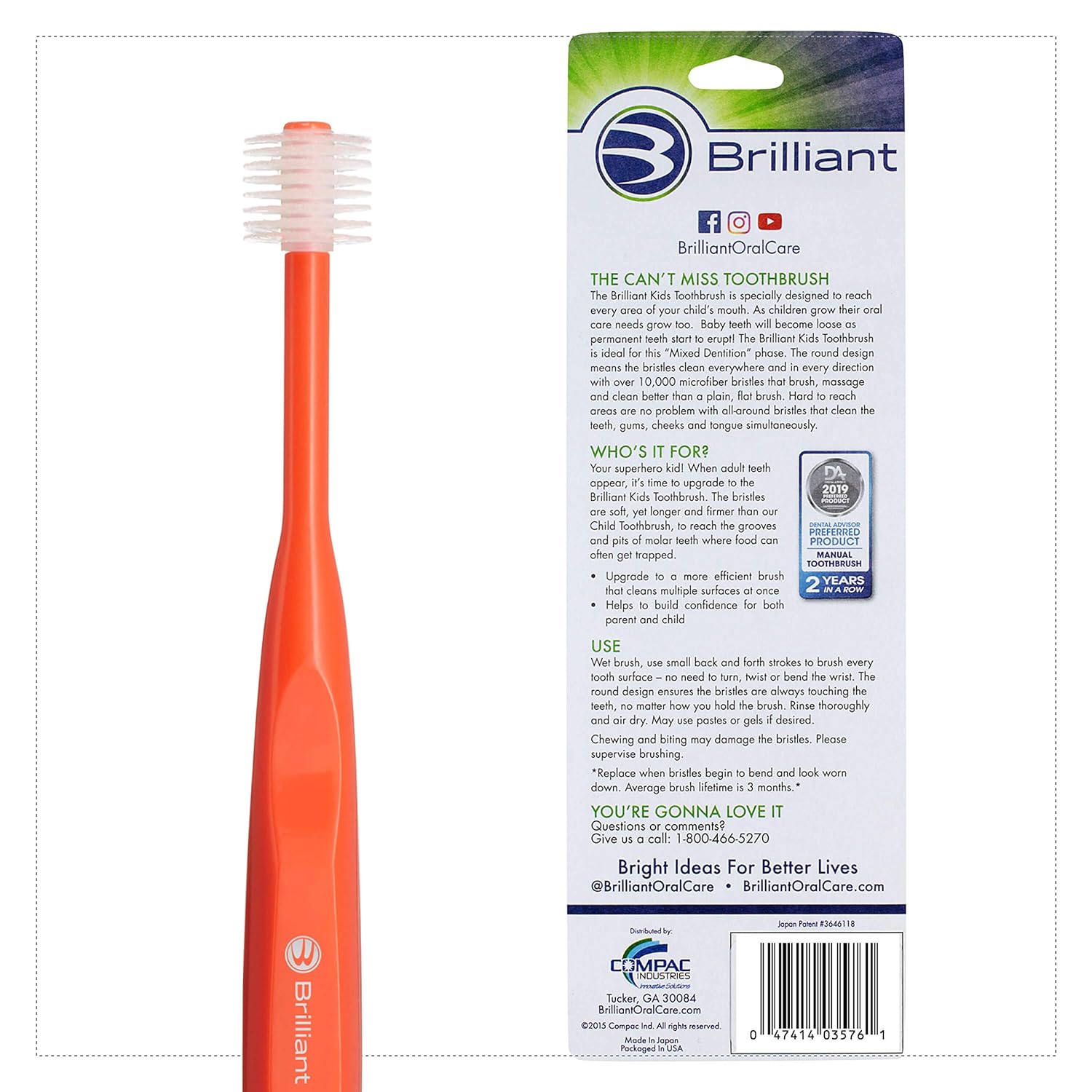 About this item ROUND HEAD – 360° round brush head that effectively cleans teeth, tongue, gums, cheeks and all the hard-to-reach places ULTRA SOFT – 12,000+ round-tip bristles, 10X more than ordinary child toothbrushes, to gently clean and massage sensitive gums, removing 1.8X more plaque CHILD APPROVED – This fun and easy-to-use toothbrush creates a love for brushing and teaches positive oral hygiene habits CONVENIENT – Innovative patented design that dries quickly, ensuring cleanliness, and is great for travel HOW TO – Created for children aged 5 to 9 years, when their adult teeth begin to emerge, for use with or without toothpaste