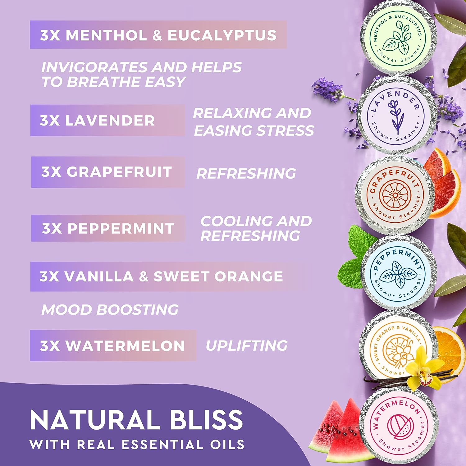 About this item Scent-Sational: This 18-Pack of shower steamer tablets features the sublime scents of 3x Lavender, 3x Watermelon, 3x Grapefruit, 3x Menthol & Eucalyptus, 3x Vanilla & Orange, and 3x Peppermint. Select one and spoil yourself. The Perfect Gift: Need some unique Mother’s Day gift ideas, teacher appreciation gifts, or perhaps just birthday gifts for women and men in your life? Our shower bombs aromatherapy are made for every occasion. Superior Self Care: Our aromatherapy shower steamers for women and men are made cruelty-free with essential oils, natural fragrances and offer pleasantly strong scents. Enjoy the benefits of an aromatherapy spa from home. Mind & Body: A home-spa experience like no other. Our shower melts help unwind and relax in the evenings and kickstart the day with great mood and energy. Say hello to restful sleep and energized mornings! Home Spa: Enjoy daily serenity as you shower the stress away. Place one of your shower fizzies in the corner of your shower and do not submerge it. Breathe slowly and deeply and enjoy the moment.